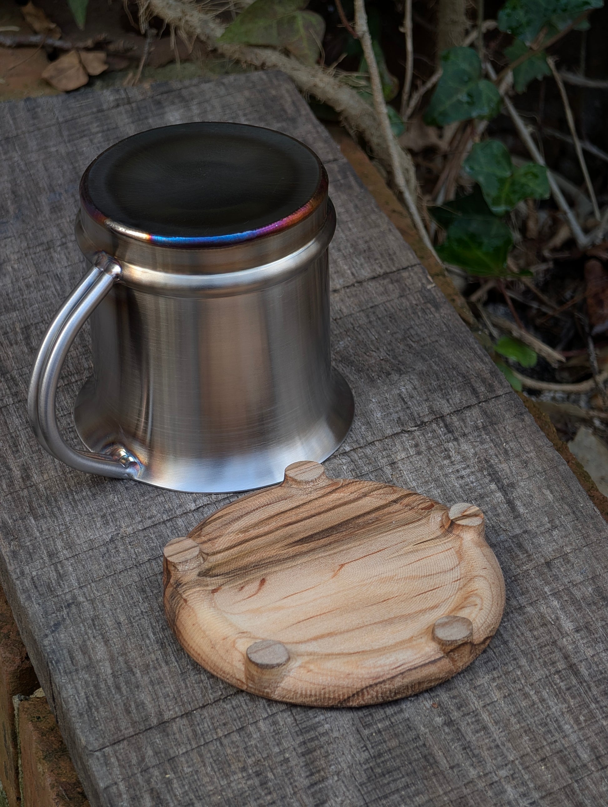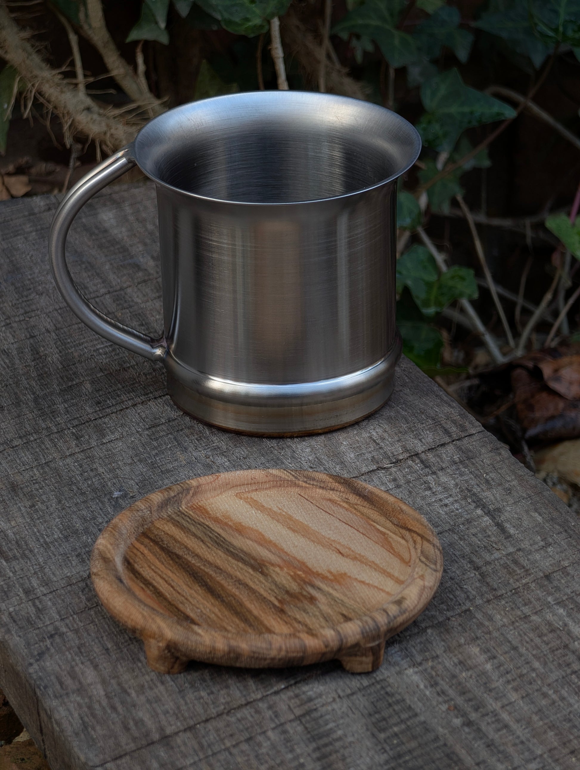 Hand fabricated, TIG welded coffee mug. Stainless steel construction, heavy feel.