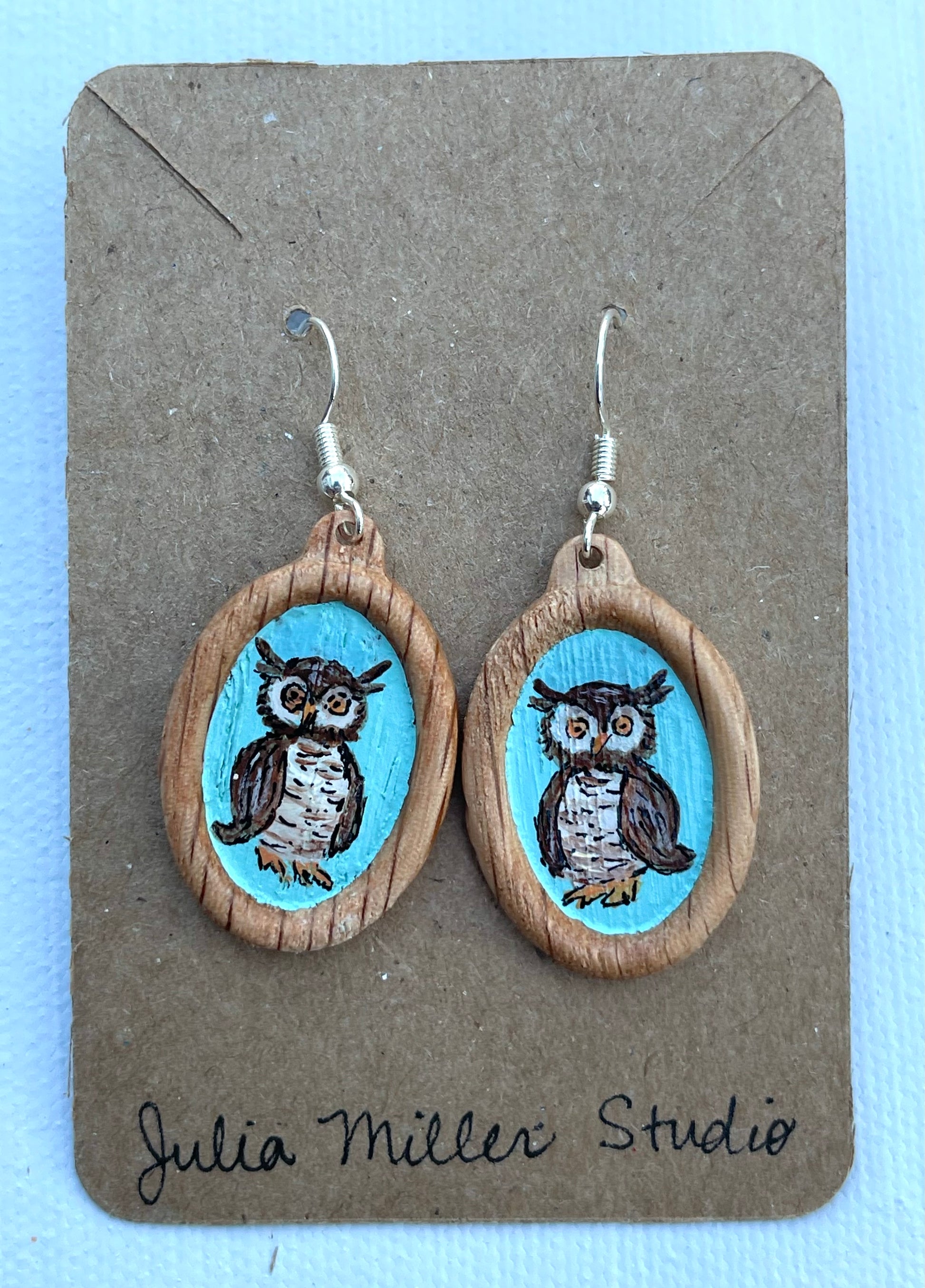 These mini masterpieces are hand painted to create the most unique earrings. We carved the frames out of oak, meticulously painted each one, and fastened them with sterling silver coated ear wires. Beautiful and interesting, weightless and whimsical-designed to bring you joy for decades! Earring measures 1 1/4"x3/4"