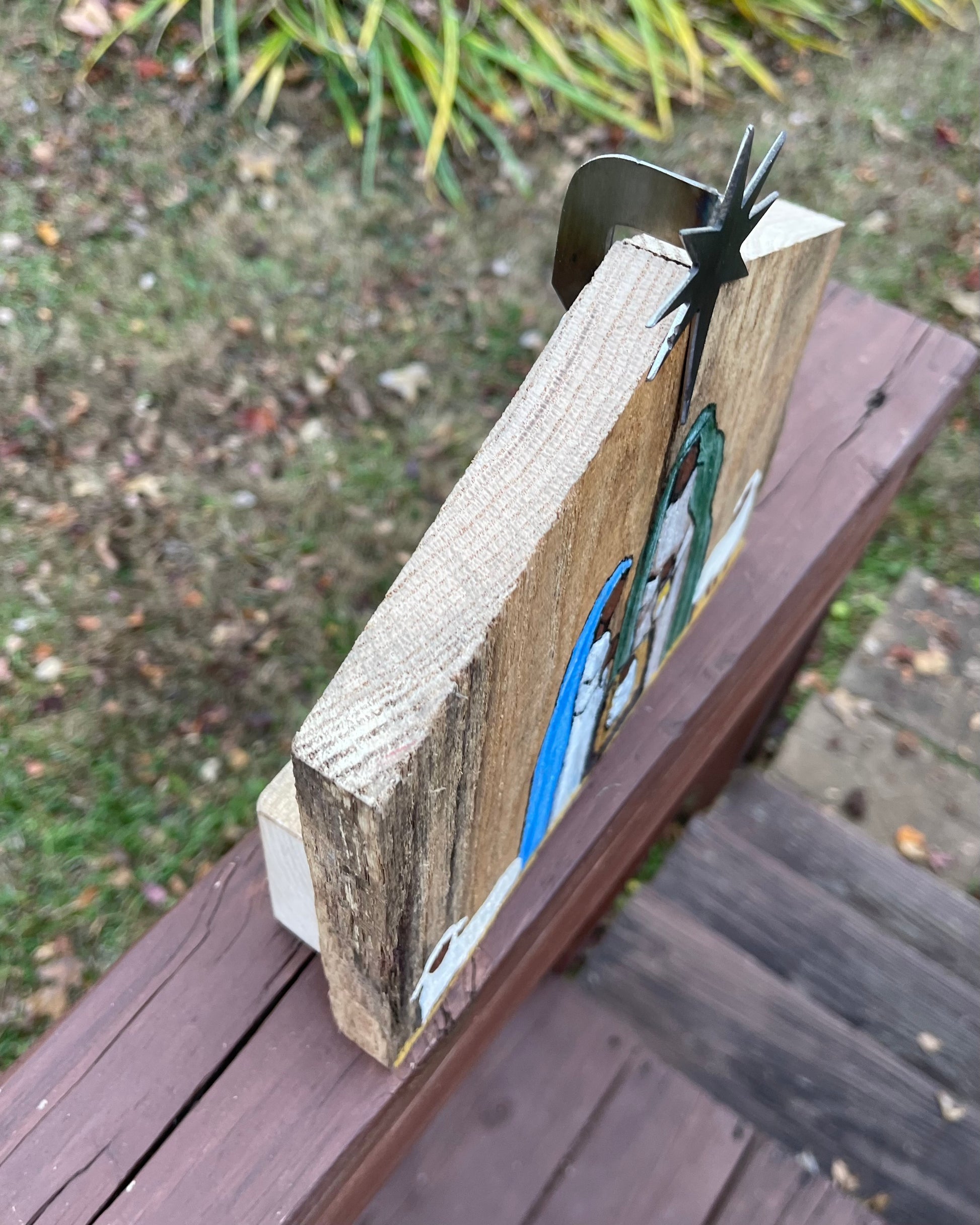 Gorgeous nativity painted on reclaimed wood with a metal star. 9 1/2" wide, 9 1/2" tall and 2" deep. Stands on its own.